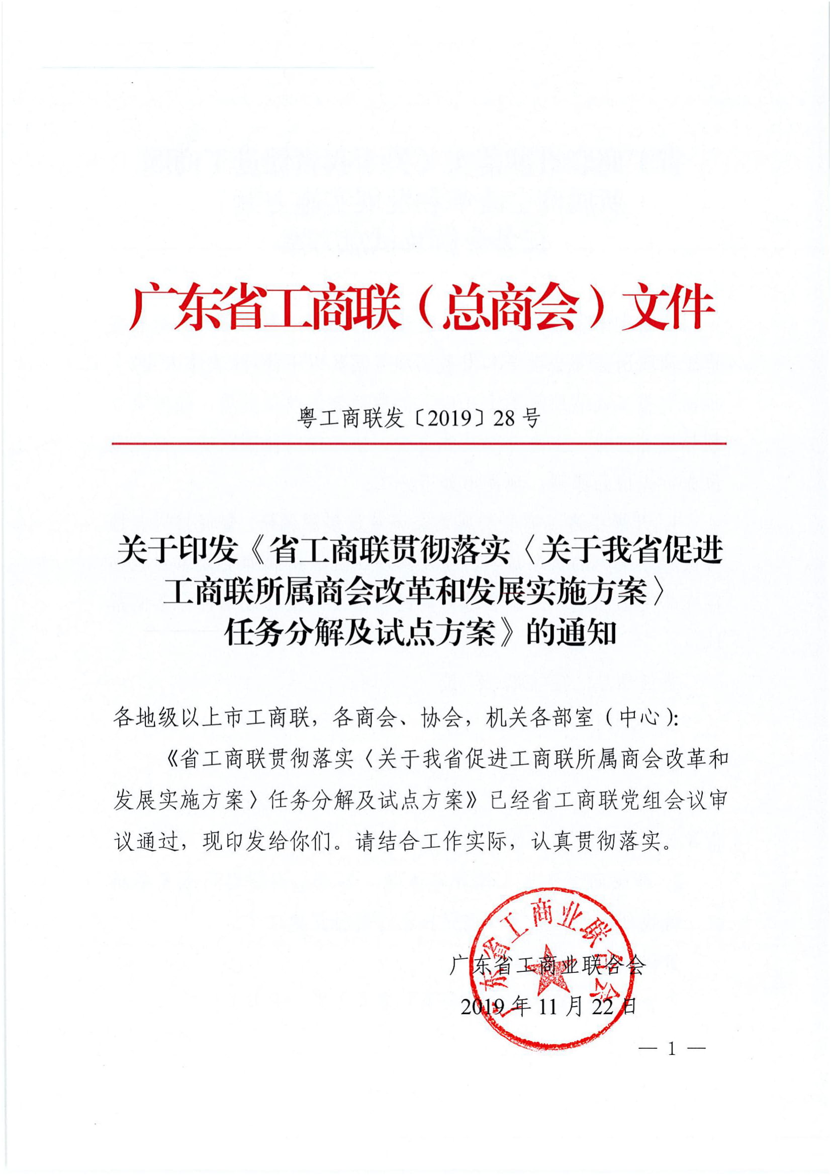 为贯彻落实省委办公厅、省政府办公厅印发的《关于我省促进工商联所属商会改革和发展实施方案》,推动我省工商联所属商会协会改革发展,按照责任领导统筹安排、主办部门具体负责、协办部门协同落实、试点单位先行先试的原则,经调研筛选、征求意见,并经省工商联党组会议审议通过,近期,广东省工商联正式下发了关于印发《省工商联贯彻落实(关于我省促进工商联所属商会改革和发展实施方案〉任务分解及试点方案》的通知。