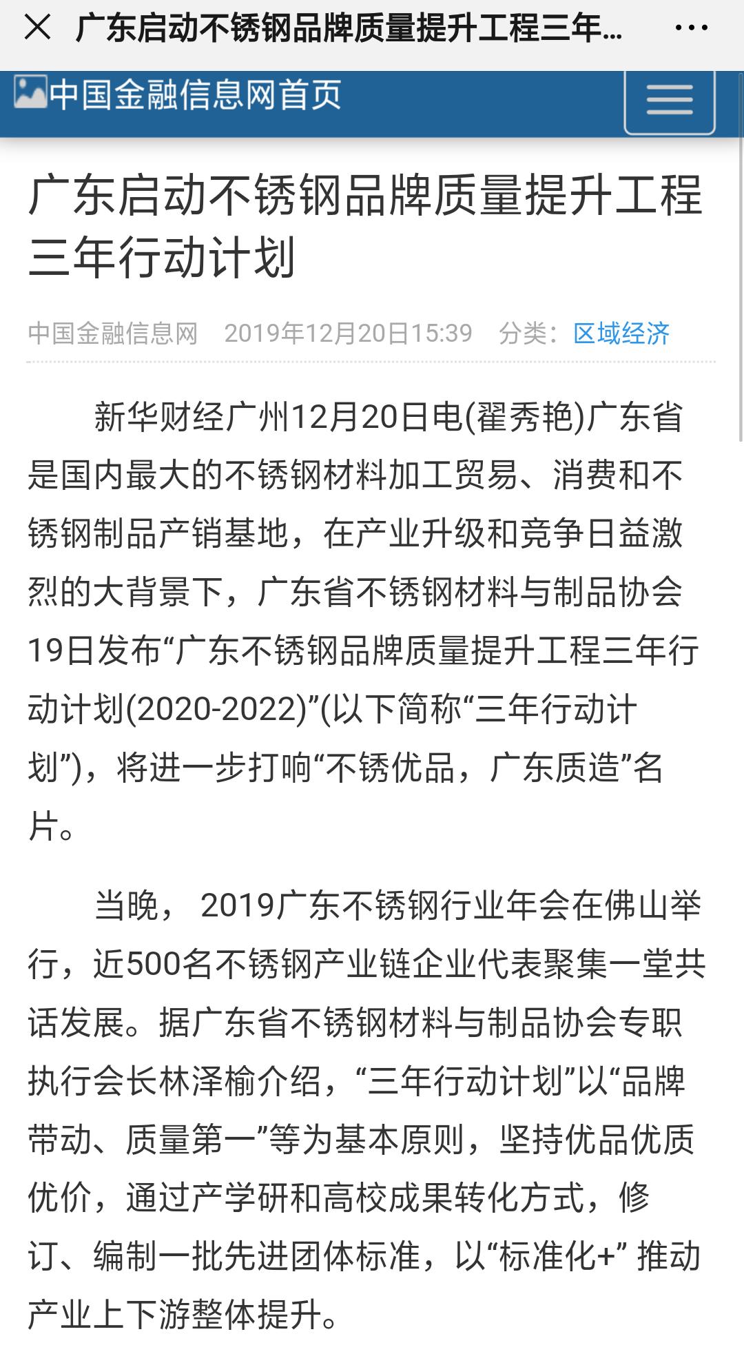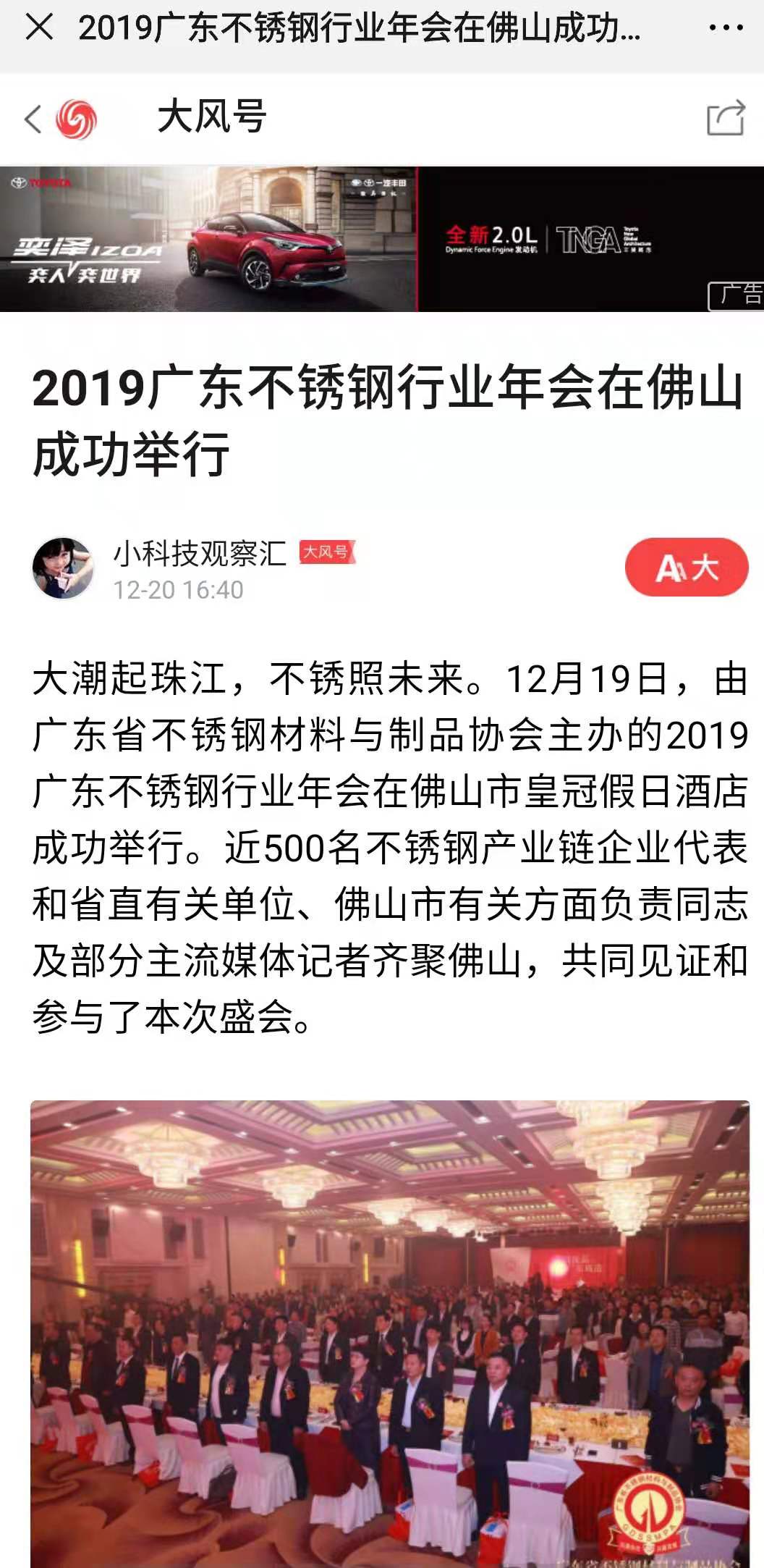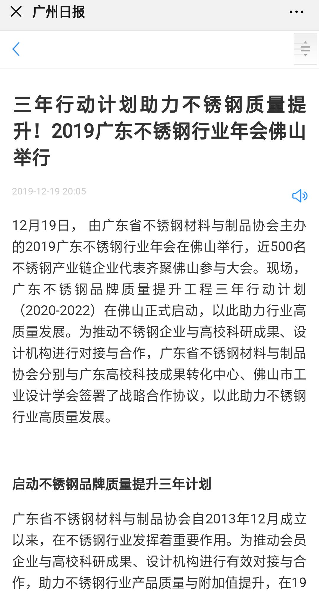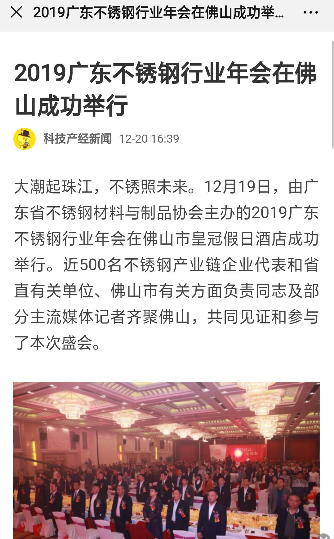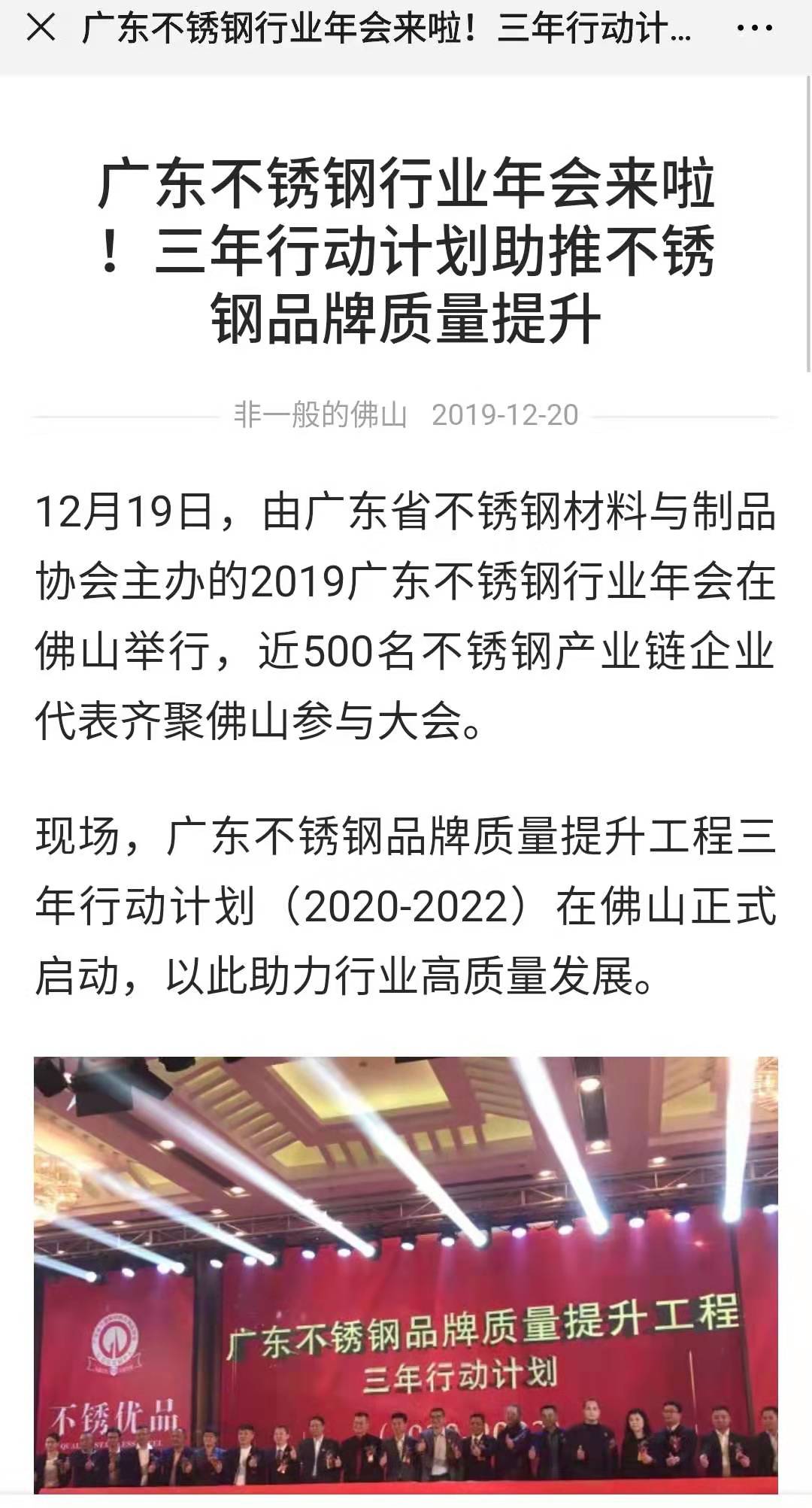 12月19日,由广东省不锈钢材料与制品协会主办的“逐梦前行 高质发展-2019广东不锈钢行业年会在佛山成功举行。会上,正式启动了广东不锈钢品牌质量提升工程三年行动计划并签署了有关战略合作协议。
