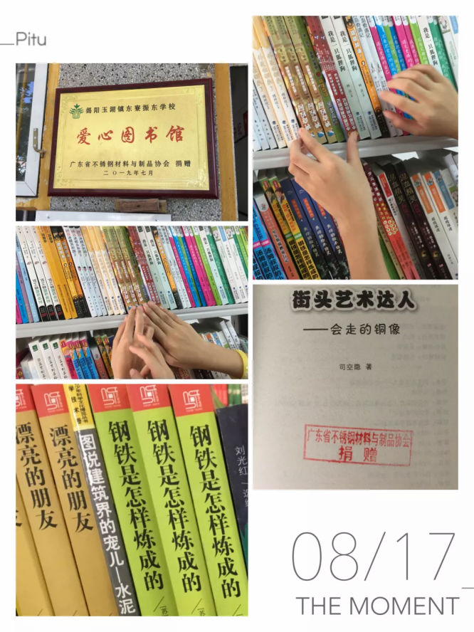 8月17日上午,在揭阳市揭东区玉湖东寮振兴小学举行“情系山区 送书助学”捐赠仪式,广东省不锈钢材料与制品协会通过广东省教育基金会资助揭阳市欠发达地区农村小学建造爱心图书馆,其中捐赠玉湖东寮振兴小学阶段高质量、可读性强图书3500册(价值3.5万元),为学生们打开了解外面世界的窗口 ,丰富课外学习生活。