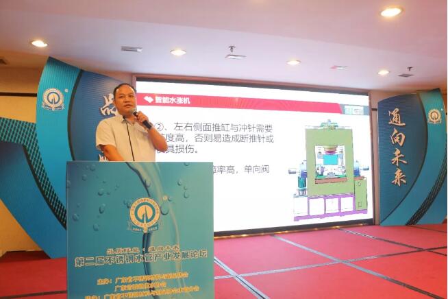 佛山市佳锐机械设备有限公司总经理吴建波主要分析了传统水涨机存在的问题,并提出新一代智能自动化设备对提升不锈钢水管生产效率的助推作用。他介绍说,新水涨机采用专利机械式锁模结构,主压油缸只有80缸径,具有用油量少、节能、环保、效率高等特点。特别是机械自锁方式,解决了因主压油缸内泄造成夹具反弹问题,维修方便,一个人可以独立完成维修工作。冲针采用专利浮动式结构,大幅度降低断针或者擦伤模具的情况。