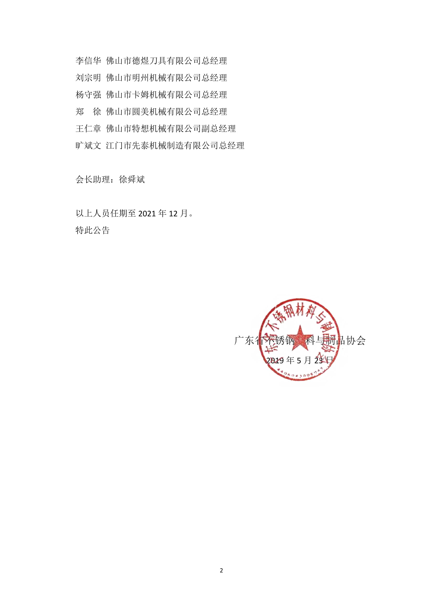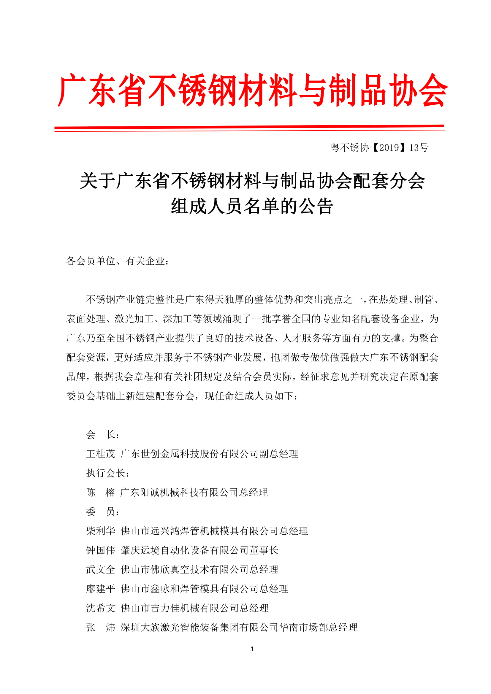 关于广东省不锈钢材料与制品协会配套分会组成人员名单的公告