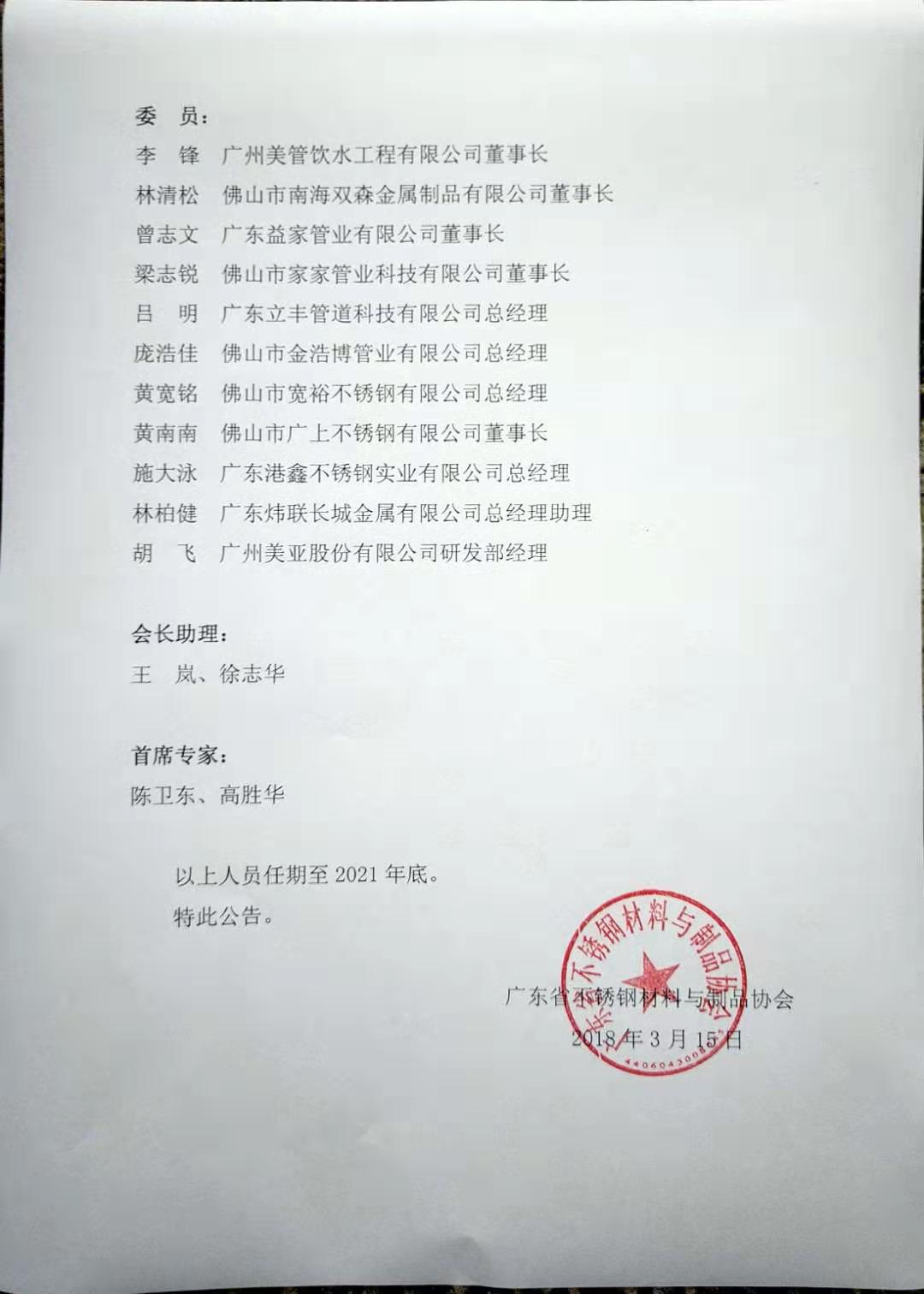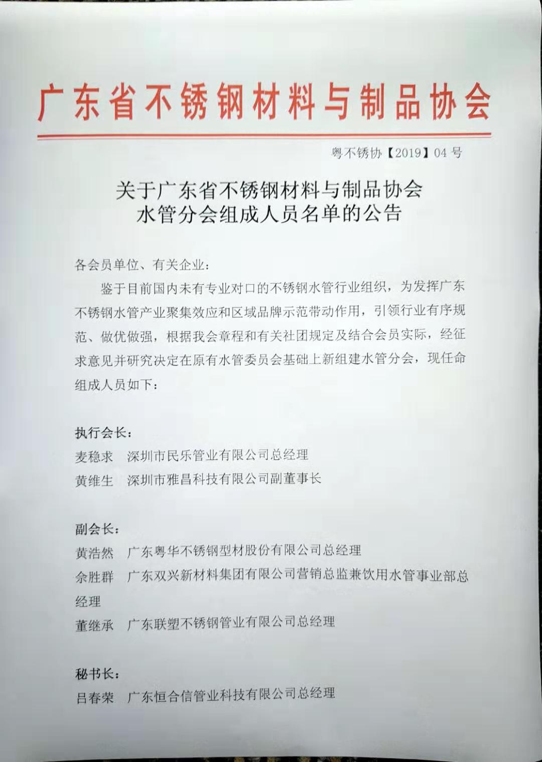 鉴于目前国内未有专业对口的不锈钢水管行业组织,为发挥广东不锈钢水管产业聚集效应和区域品牌示范带动作用,引领行业有序规范、做优做强,根据我会章程和有关社团规定及结合会员实际,经征求意见并研究决定在原有水管委员会基础上新组建水管分会,现任命组成人员如下: