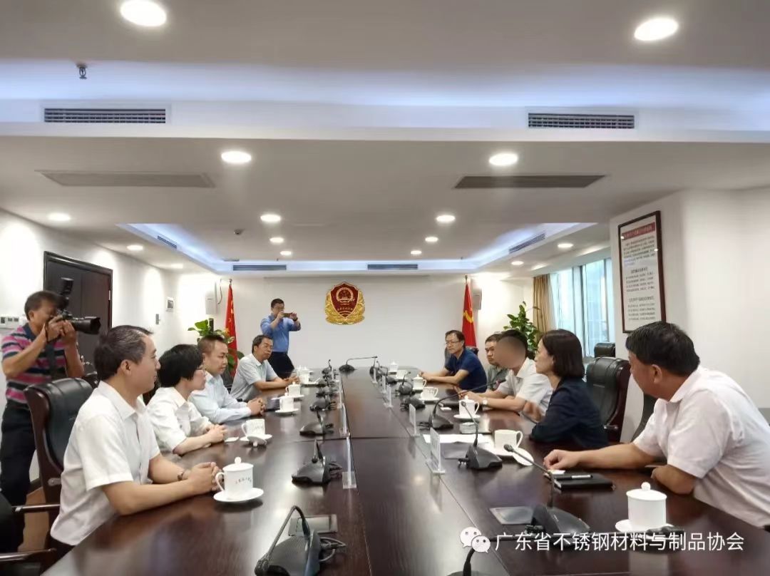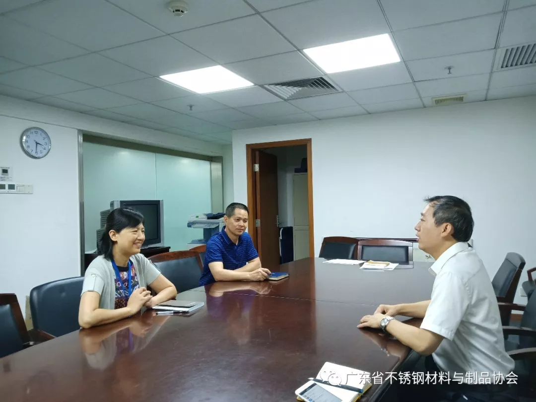 在商标管理处,张晓英处长、冉宗权科长予以热情接待,林会长首先感谢张处长再次给予关心指导和听取汇报,重点汇报了下一步我会就集体商标和团体标准有机结合以打造广东不锈钢区域品牌,通过授权会员单位无偿使用集体商标和相关查询系统,加大宣传力度等举措;同时针对省外部分不法企业傍广东不锈钢知名品牌的行为给相关企业带来的负面影响和损失的问题,请求省工商局在维护我省不锈钢行业合法权益方面予以指导和支持。张处长听取汇报后指出,省不锈钢材料与制品协会成功注册了集体商标不容易,工作提前谋划、思路清晰开阔,包括在维护会员和我省不锈钢行业的合法权益方面的努力和探索都值得肯定赞赏。她介绍了省政府办公厅去年印发的相关文件并作重点解读。张处长表示,在维护行业尤其是知名品牌商标相关合法权益方面将给予必要的指导支持,在确需省局出面协调时可由我会发函,省局再行研究协作办理。