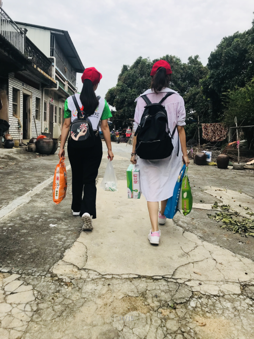组员们拿着捐助物资走进揭阳市的桂岭镇