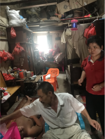 3、李锦荣原先是环卫工人,去年因为中风住院治疗,丧失了劳动力,现在行动不便,就连说话也不是很利索。他的妻子也是精神病患者,两人育有三个儿子,大儿子一生下来就有智力残疾,二儿子今年六月份外出打工时不幸出了车祸身亡。现在全家未来唯一的希望就寄托在今年3岁的小儿子身上。我们去到李锦荣家里的时候,看到一家四口挤在一间小小的房间里,房间摆了床和桌椅之后,只留出了一小片空地,而这片空地也就刚好够大儿子躺在地上休息。那一刻我才真正亲身体验到,什么叫家徒四壁。李锦荣看到我们过来,情绪有点激动,虽然说话不利索,但是还是很艰难地向我们在表达他的感受,跟我们同行的本地人阿峰担任我们的翻译。当时再现场,其实我没怎么听得进去阿峰的翻译,我只记得李锦荣重复了很多次“绝望”。听到同行的小伙伴有断断续续的抽泣声,再听到李锦荣那不断重复着的“绝望”,真的让人很难过。那是我第一次这么真切的近距离感受一个“绝望”的人和家庭。