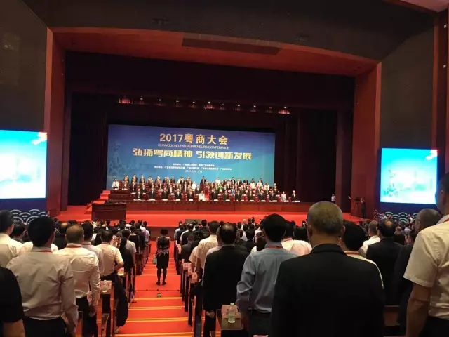 本届大会主题为弘扬粤商精神,引领创新发展。大会在雄壮的国歌奏响下拉开序幕。
