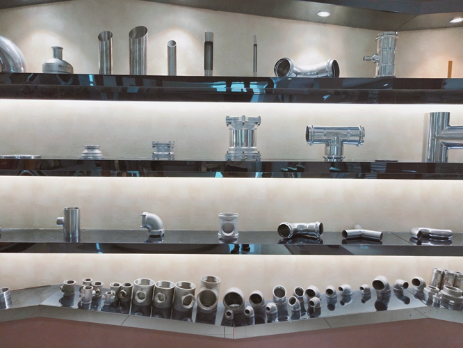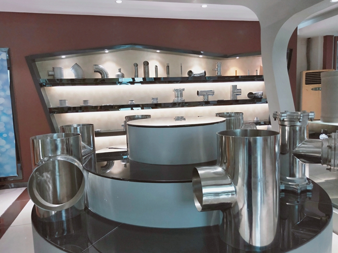 在金浩博管业,首先在庞总的带领下参观了其展厅及生产车间。庞总介绍正在车间装车出货的316不锈钢管道及管件进行介绍,正是运往用于深圳水务工程项目的产品。