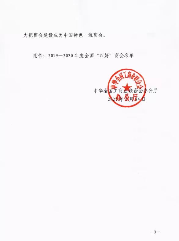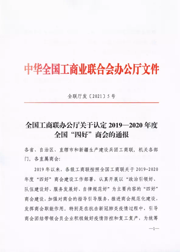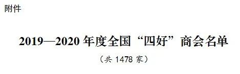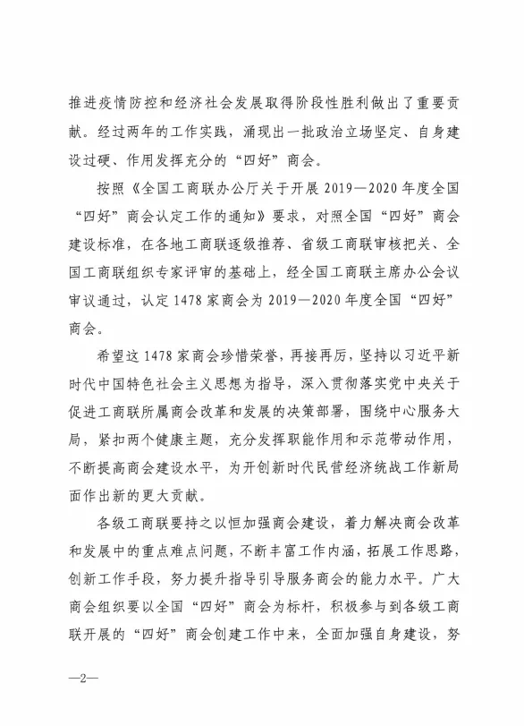 全国工商联在通报中指出,对照全国“四好”商会建设标准,在各地工商联逐级推荐、省级工商联审核把关、全国工商联组织专家评审的基础上,经全国工商联主席办公会议审议通过结果,认定1478家商会为2019-2020年度全国“四好”商会。