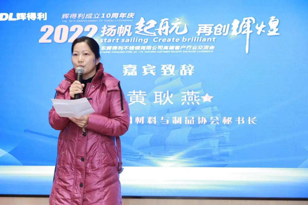 在成立十周年的好日子之时,她代表广东省不锈钢材料与制品协会向广东辉得利不锈钢致以热烈的祝贺,并祝愿辉得利在陈董事长的带领下,继续发挥自身优势、不断攀登、再创辉煌。