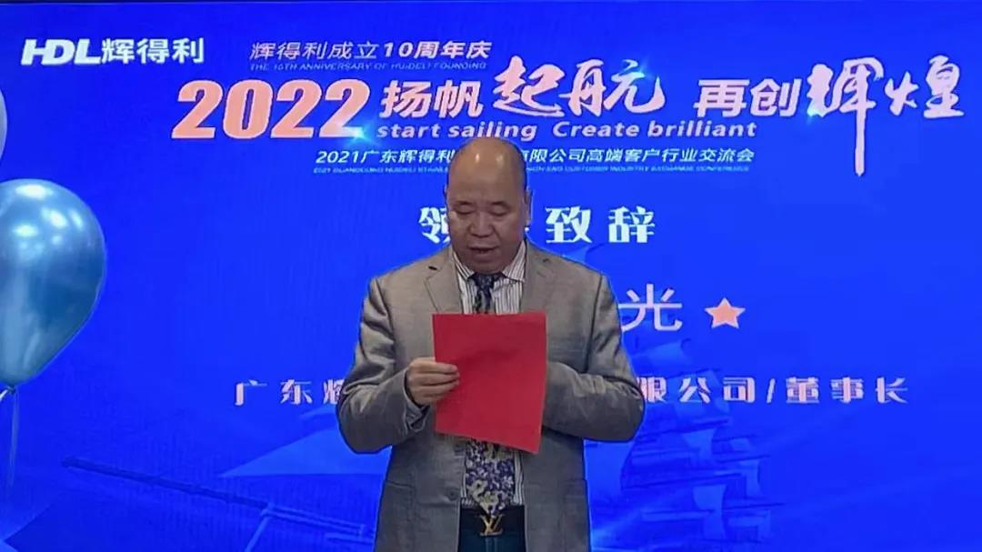 广东辉得利不锈钢董事长陈淦光首先作了激情洋溢的致辞,向前来参加本次庆典的来宾表示感谢。他表示,2021是难忘的一年,也是值得纪念的一年。疫情时常反复,但辉得利始终坚持不懈,不断钻研,在不锈钢领域不断探索,所有打不到辉得利的危机,都将成为辉得利的勋章。