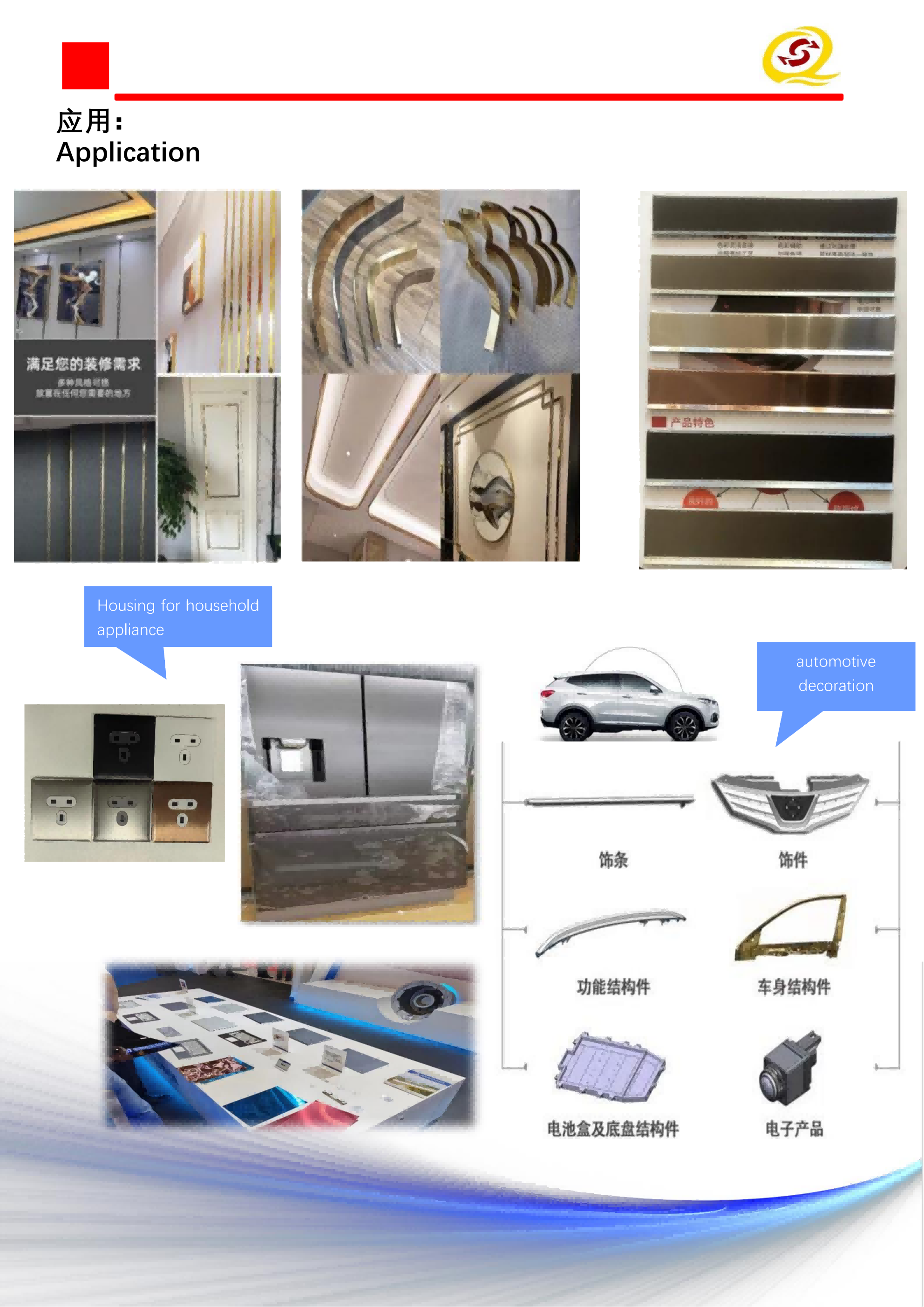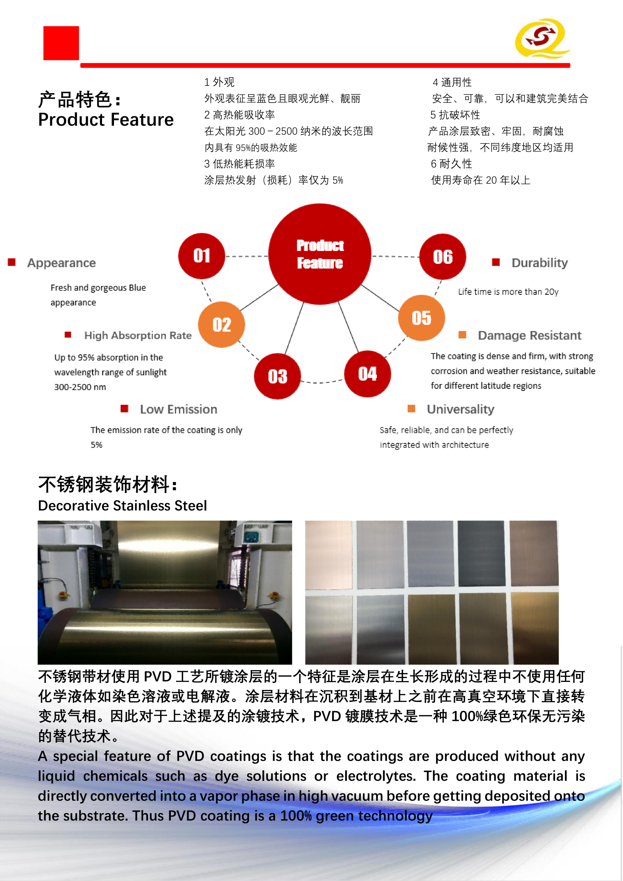 目前,该公司可对不锈钢等金属材料进行整卷表面加工和镀色,所生产的产品主要应用于家电、电梯、汽车装饰亮条、室内外装饰、幕墙、光学仪器、灯具等行业,具有良好的市场前景。