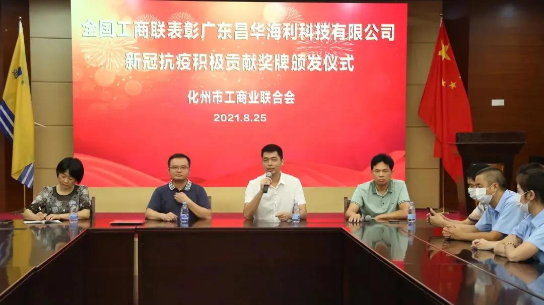 化州市委统战部副部长、市工商联党组书记凌召文在颁发奖牌仪式上讲话指出:昌华海利公司一直以来全力支持疫情防控工作,勇于担当,积极履行社会责任,通过捐款、组织复工复产,积极参与应对疫情防控,不仅为疫情防控捐款120多万元,还扎实做好“六稳”工作,落实“六保”任务,为促进经济社会发展作出重要贡献,充分展现了行业领军企业的标杆与榜样力量。