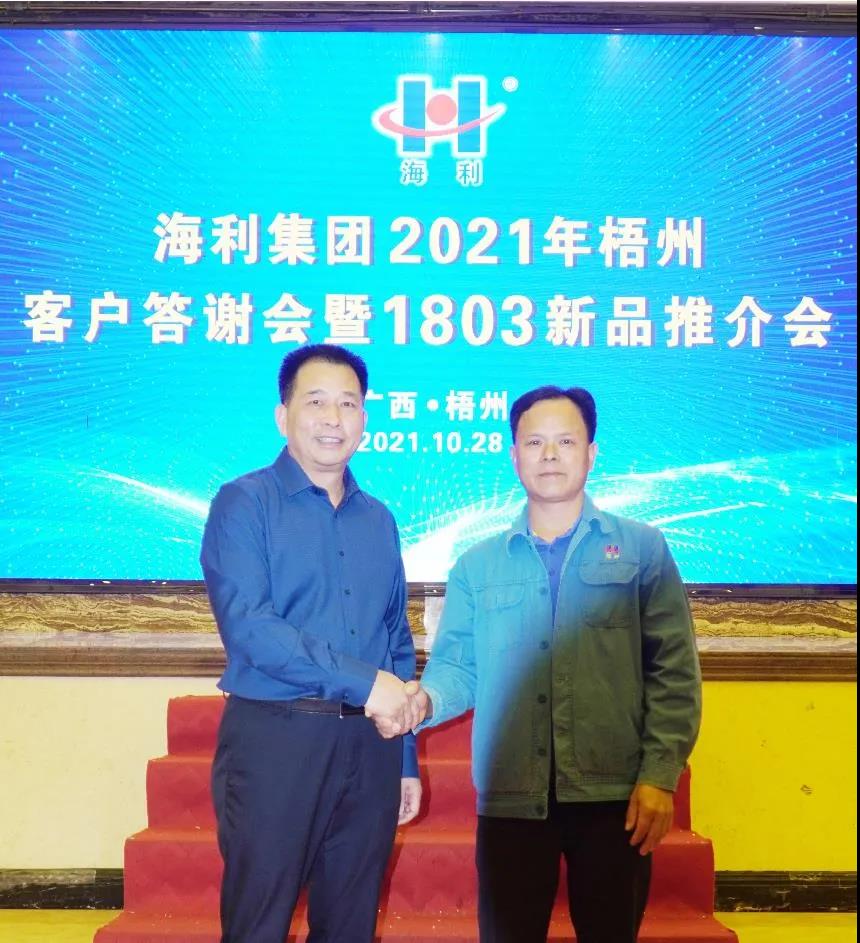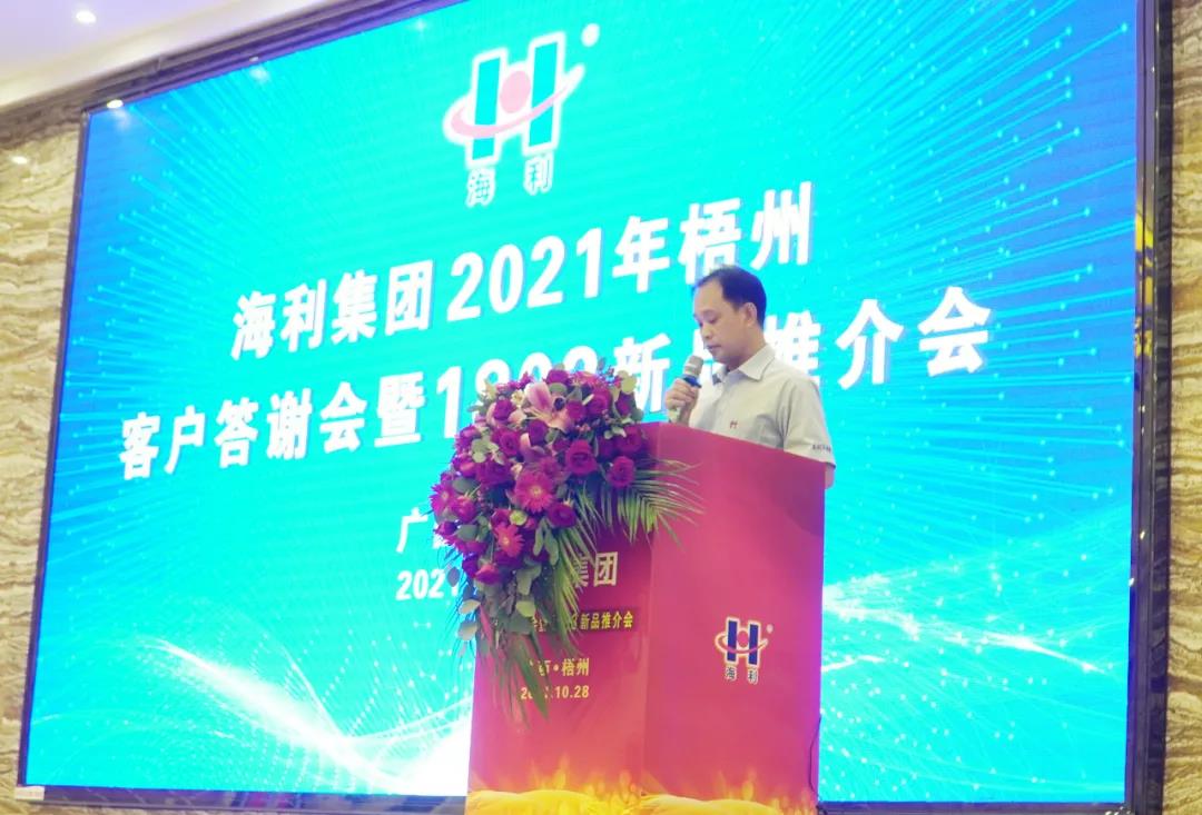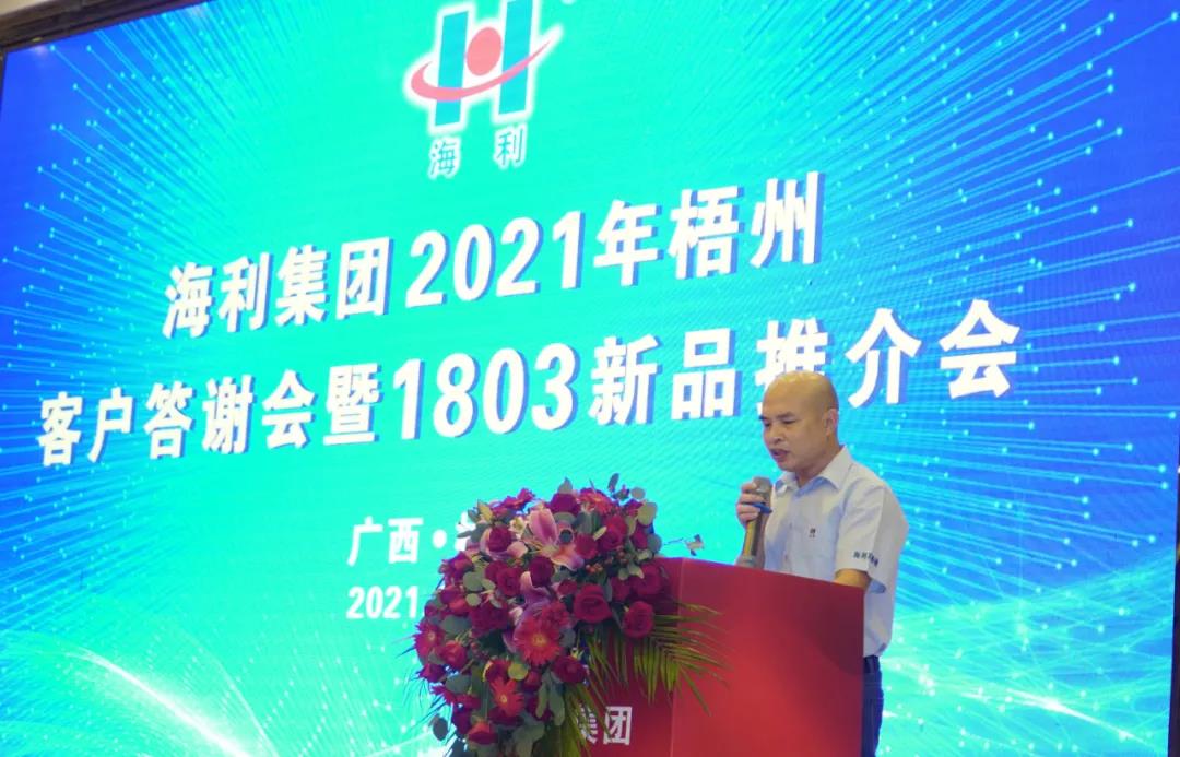 10月28日,广西梧州海利经销合作伙伴和加工商老板400多人齐聚梧州市东盛大酒店,参加2021年广西梧州客户答谢会暨海利1803新品推介会,会议由经销合作伙伴陈敏智主持,海利经销合作伙伴代表陈鹏帆致欢迎词。