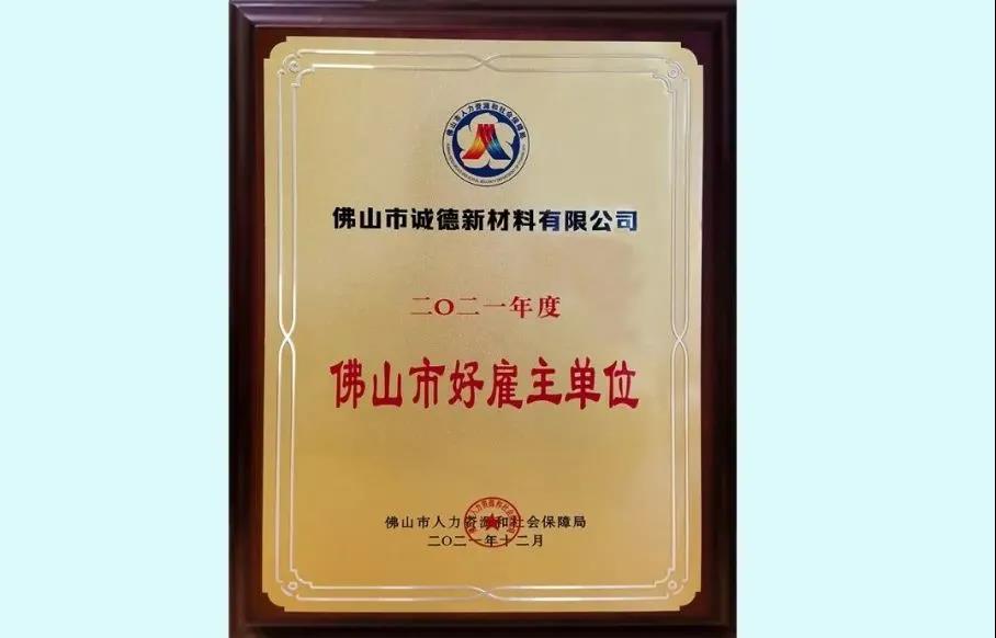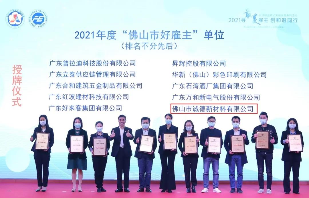 佛山诚德荣获2021年度“佛山市好雇主单位”称号