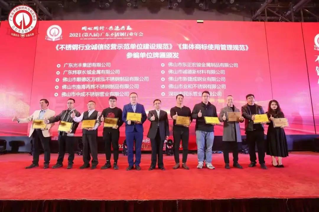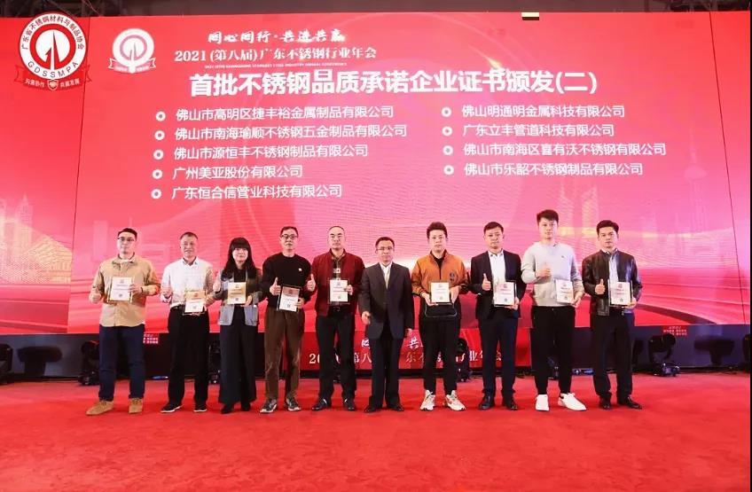 十二月,在广东省不锈钢材料与制品协会主办的”同心同行 共进共赢”2021(第八届)广东不锈钢行业年会中,我们获得了由协会授予的《不锈钢品质承诺企业证书》,实力得到了行业的认可!