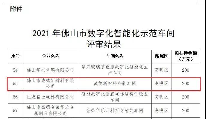 2022年1月4日,佛山市工信局对2021年佛山市数字化智能化示范车间评审结果进行了公示。高明区4家企业入选,广东省不锈钢材料与制品协会副会长单位佛山诚德新材料名列其中。