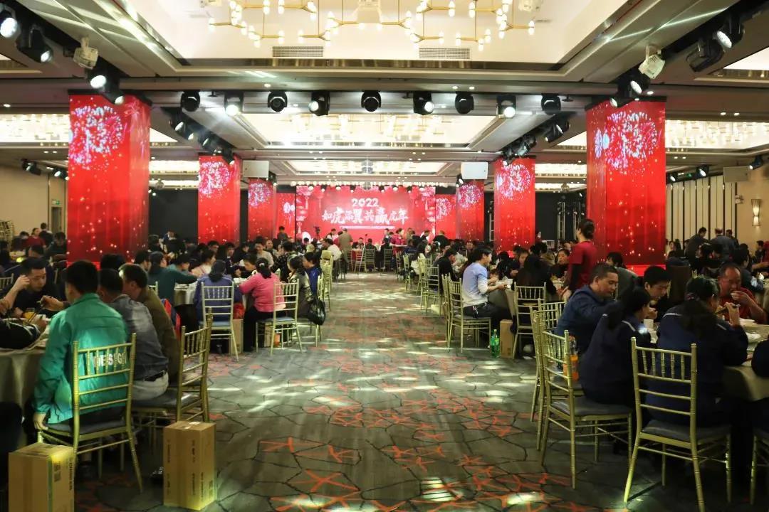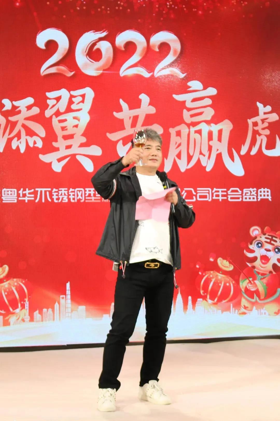 2021年工作总结与表彰大会后,万众期待的粤华不锈钢年会盛典在开场舞节目《鼓舞盛世》的精彩表演中拉开帷幕。粤华不锈钢董事长林树灿先生在晚宴伊始致祝酒辞,对粤华全体员工及家属送上诚挚的新年祝福,并表示感谢。