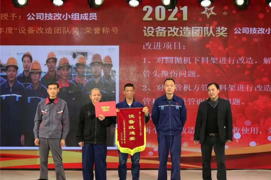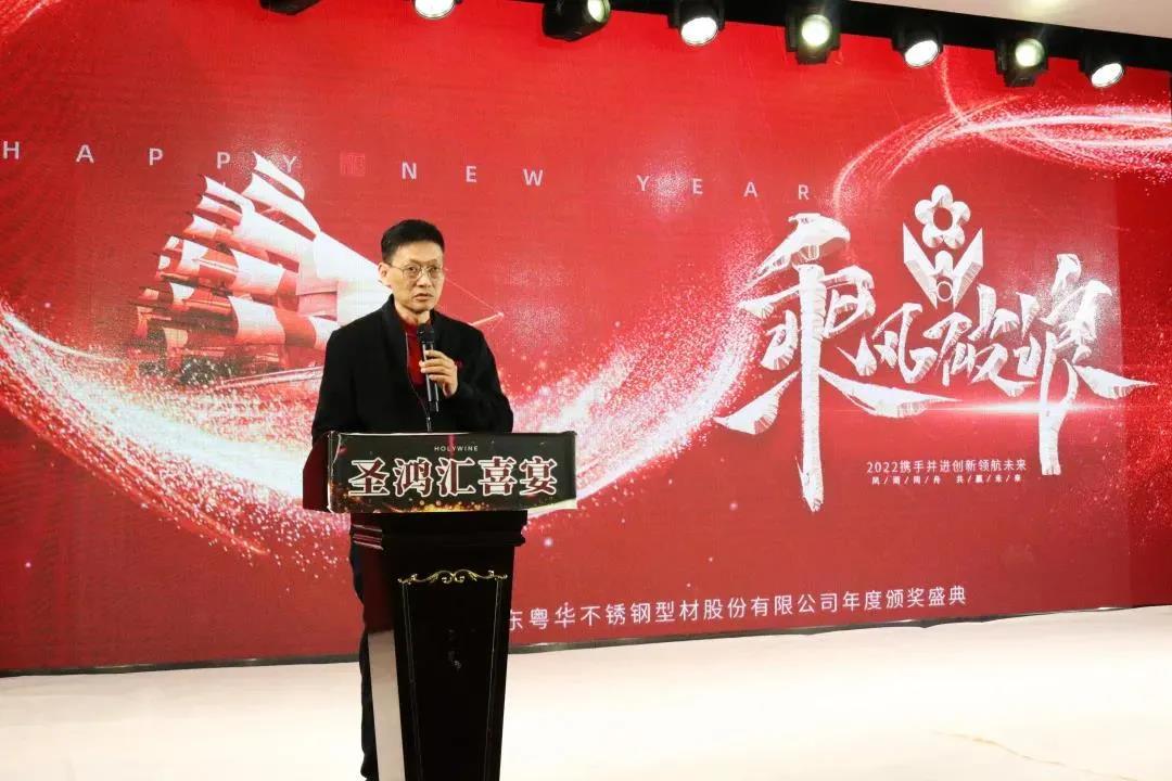 新时代绘制新蓝图,新征程吹响新号角。此次年会首先由总经理黄浩然先生作2021年的努力成果总结和2022年的奋斗方向,并表示:2021年新冠病毒疫情依然肆虐不止,材料价格猛涨,停电限电、钢厂违约、房产限建等不利因素接踵而至,给不锈钢各产业链带来了前所未有的困难和挑战,在困难面前,我们全体粤华员工不离不弃,团结协作积极应对,公司高层与营销部主动出击化解经销商变动风险,采取了多项措施,将影响降到最低,在全体员工的努力配合下,取得了喜人的成绩。新的一年,我们要着重落实好以下四件事:一、改革经营战略决策和管理运营责任机制;二、继续着力发展装饰管外销业务、水管、燃气管业务、工业管业务,铝材业务;三、投资引进先进生产设备;四、集中继续聚焦生产精细化管理,稳定提升产品质量、生产工艺技术水平等。粤华一定能够迈上新的台阶,取得又一个新的发展辉煌!