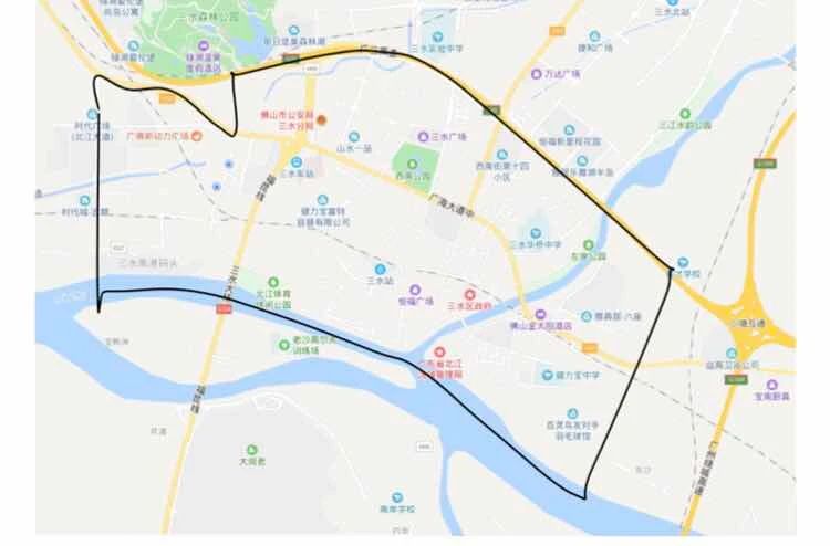 (四)三水区限制通行范围。东起与南海区接壤的丁字基,西至口岸大道,南起北江大提,北至广三高速公路区域(不含口岸大道、北江大堤、广三高速公路)。